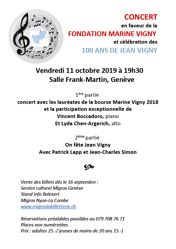 Rappelons que le Conservatoire de Musique de Genève, Fondation Bartholoni, est l’institution dans laquelle Madame Marine Vigny fit ses études dans la classe de virtuosité de Johnny Aubert et au sein de laquelle, plus tard, elle participa longtemps comme juré et fréquemment comme professeur.